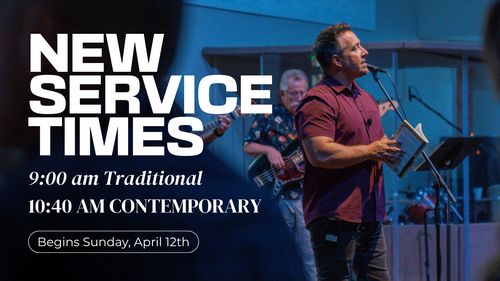 Beginning Sunday, April 12th, we are going to try out some new service times. Meet us at 9:00 am (Traditional) or 10:40 am (Contemporary). This later Contemporary service will help our tech team, and it will ensure that we aren't rushing through the Traditional service. Enjoy an extra 10 minutes of sleep, Contemporary folks!