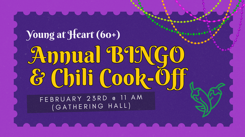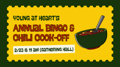 Seniors, join us on February 23rd at 11:00 am in the Gathering Hall for this highly anticipated, co-ed event. We'll have a scrumptious chili cook-off with some very official judges as well as plenty of BINGO to follow. See you soon!